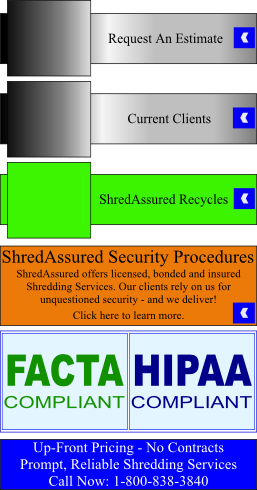Please click here for more information, or give us a call at 1-800-838-3840 to find out how ShredAssured can help your company save money, protect the environment, protect its information, and comply with federal and state laws. Our client specialists are ready to assist and willing to help in any way they can.